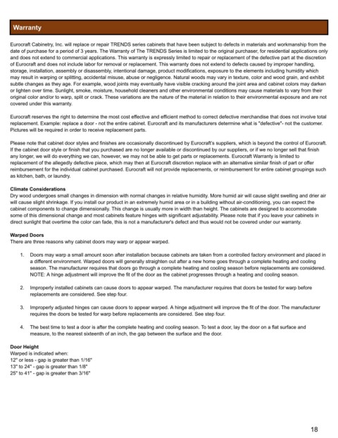 Eurocraft Cabinetry, Inc. will replace or repair TRENDS series cabinets that have been subject to defects in materials and workmanship from the